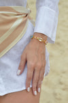 An elegant bracelet featuring soft, multicolored stones linked in a refined gold setting. Delicate yet striking, it adds a subtle touch of color and sophistication to any look. Crafted with 18K gold plating at 10 millesimal, completely nickel-free and hypoallergenic, designed for comfortable, all-day wear.
