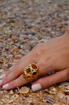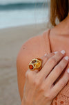 A bold statement ring featuring warm-toned stones set in a sculptural gold design. Crafted with 18K gold plating at 10 millesimal and completely nickel-free, this hypoallergenic ring is designed for comfortable, all-day wear.